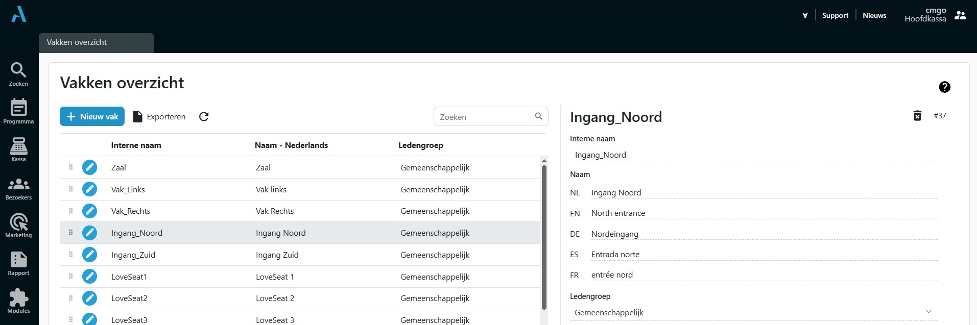 Dit onderdeel gebruik je alleen als je organisatie werkt met zaalplattegronden ( ActiveSeats), waarin sprake is van een aparte onderverdeling van zalen in vakken (die dan apart aanklikbaar zijn voor een bezoeker). Je kunt dan denken aan zaaldelen als Vak Links, Vak rechts etcetera. Om dat te kunnen doen moeten eerst de labels voor de vakken worden aangemaakt. Dit doe je vanuit het Vakken overzicht. Je hebt alleen toegang tot dit beheer als je het recht hebt om ook rangen aan te maken en te bewerken.