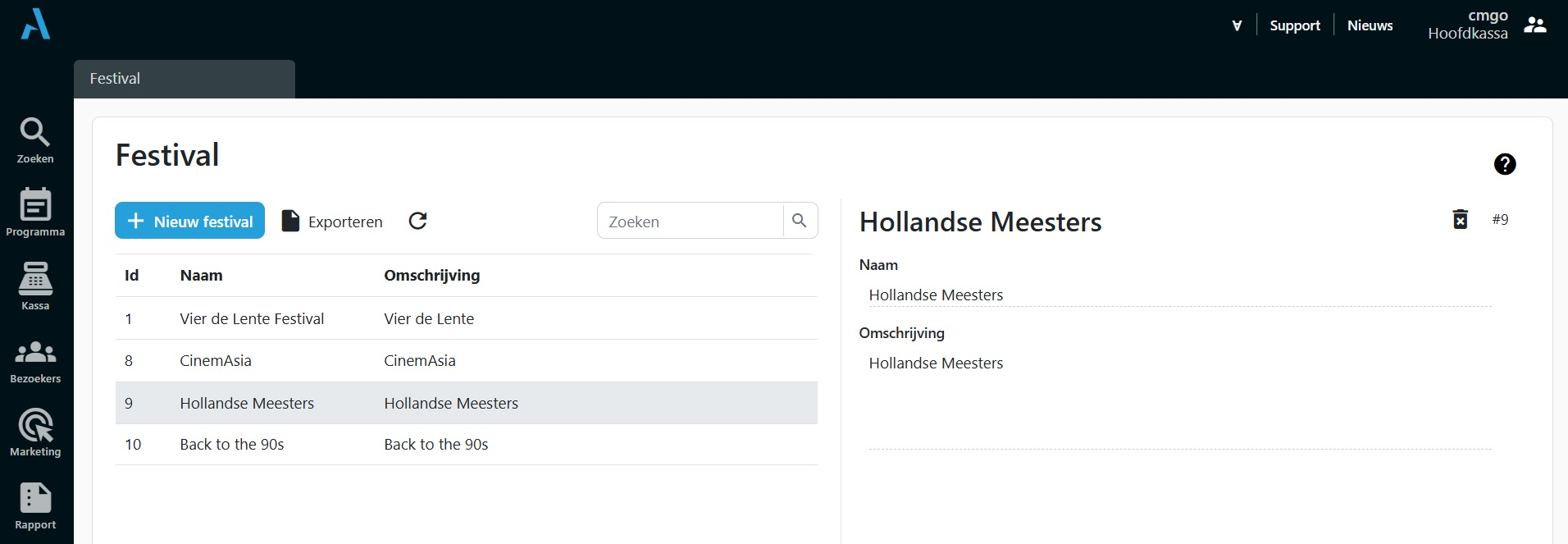 Nieuwe festivals kun je onbeperkt aanmaken. Klik op Nieuw festival om een nieuwe aan te maken. Stel eventueel een omschrijving in (niet verplicht).