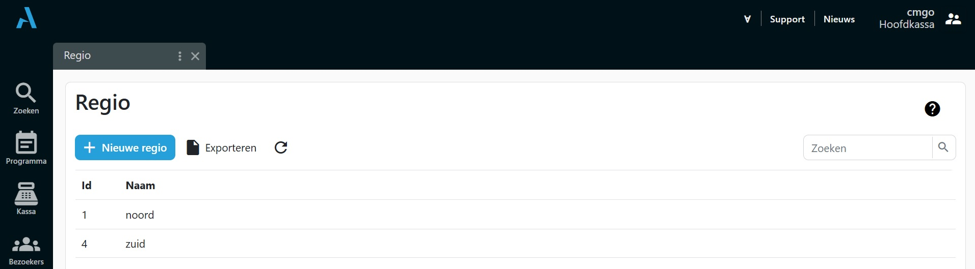 Dit onderdeel kun je gebruiken om programmering van verschillende locaties onder te verdelen in regio's, bijvoorbeeld Regio Amsterdam, Rotterdam of Den Haag. Het is ooit gemaakt specifiek voor de Cineville koppeling en filtering en rapportage richting Cineville, dus wordt vooral door filmtheaters gebruikt. Om de pagina te kunnen zien en items aan te maken en te bewerken heb je het recht nodig om regio's te beheren.