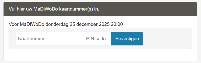De MaDiWoDo-checker is niet standaard beschikbaar. Deze kan in aanvulling op de standaard kassakoppeling van de Bioscoopbon apart geactiveerd worden. Je organisatie heeft hiervoor een overeenkomst nodig met Bioscoopbon en ActiveTickets heeft de benodigde authenticatiegegevens (zoals een aparte Client ID) nodig om de koppeling aan te zetten. Bioscoopbon voert een gescheiden administratie ven afrekening voor wat betreft het gebruik van de normale Bioscoopbon en de MaDiWoDo-kaarten. Deze koppeling staat geheel los van het gebruik van de Digitale Bioscoopbon als betaalwijze in het betaalplatform.