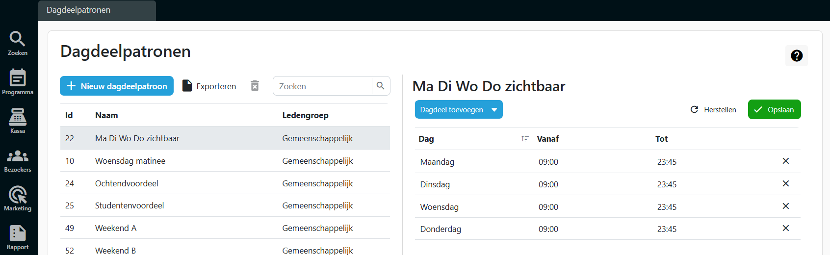 Een patroon kan een periode zijn op 1 specifieke dag, of uit meerdere dagen bestaan. Je voegt elk onderdeel dan apart toe met Dagdeel toevoegen. Voor elk onderdeel stel je de Vanaf-tijd in en de Tot-tijd apart in, zodat je een weekend tarief bijvoorbeeld kan laten gelden voor voorstellingen vanaf vrijdagavond x tijdstip tot en met zondagmiddag x tijdstip.