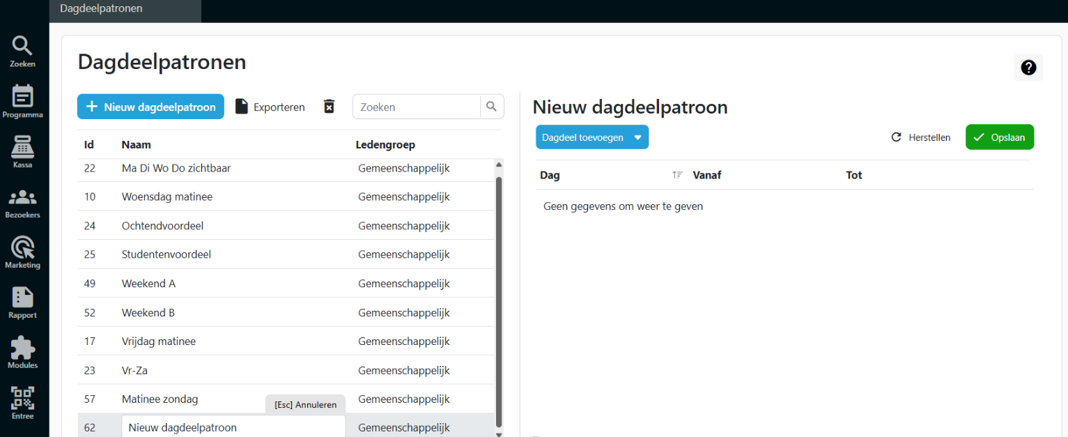 Ga voor het aanmaken van dagdeelpatronen in de backoffice naar Dagdeelpatronen. Klik op Nieuw dagdeelpatroon om speciale tijdregels in te stellen voor het tarief dat je wilt verkopen. Je nieuwe patroon verschijnt als aparte regel onderaan je overzicht. Je kunt daar de naam direct aanpassen naar een eigen naam.