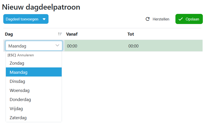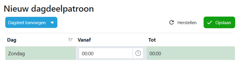 Had je nog geen patronen aangemaakt, dan kun je uit de kaartsoort via de Beheer knop achter deze optie direct naar het Dagdeelpatronen beheer om er eentje aan te maken. Als je de dropdown dan ververst via Verversen kun je deze meteen gebruiken voor je inrichting.