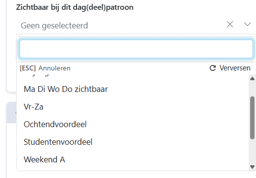 Je kiest hier heel eenvoudig het te koppelen dagdeelpatroon voor de zichtbaarheid van de kaartsoort uit een dropdown: