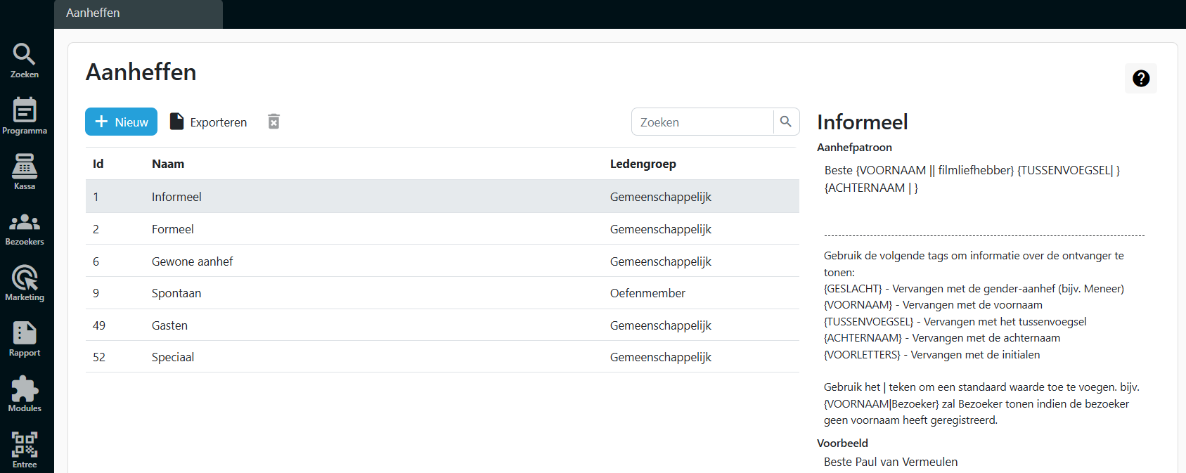 Het is optioneel, maar je kunt ervoor kiezen te werken met verschillende typen aanspreekvormen in je mailings uit ActiveMailer, zoals een formele of informele aanhef, deze kun je zelf instellen en dan koppelen aan elke mailing die je maakt. Dezelfde aanheffen kunnen ook worden gebruikt in de Gastenlijst module voor de Gastenlijst uitnodigingen.