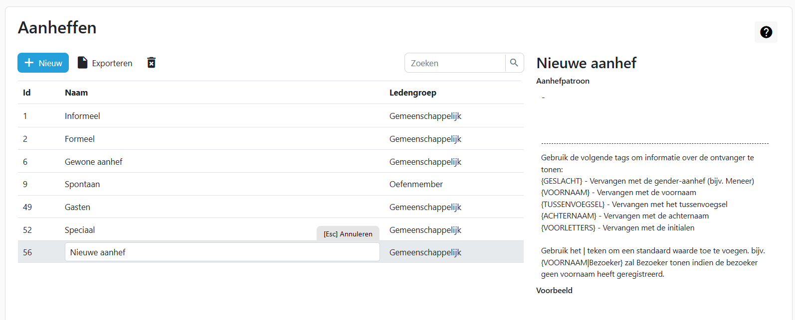 Klik op Nieuw om een nieuwe aanhef aan te maken. De nieuwe aanhef verschijnt dan als aparte regel in je overzicht en je kunt direct de naam aanpassen naar een eigen naam.