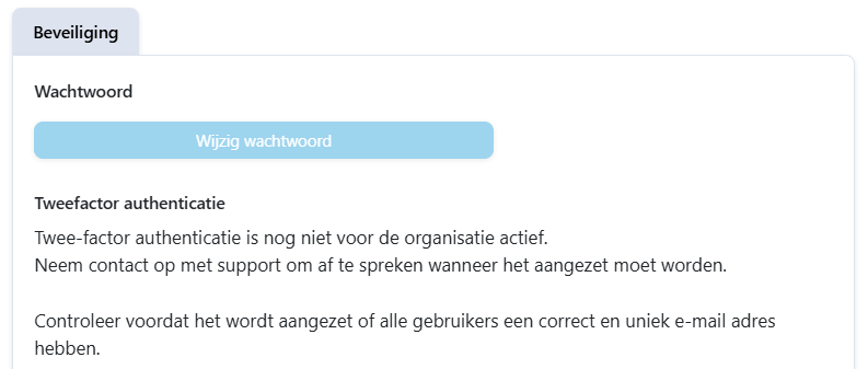 Deze functie is beschikbaar voor de actuele backoffice (membernaam.newbackoffice.activetickets.com, niet voor de oude backoffice omgeving, die te herkennen is aan het blauw-witte navigatie menu). Als twee-factor authenticatie nog niet aan staat voor je organisatie zie je onderstaande melding bij Beveiliging in het beheer van een gebruiker: