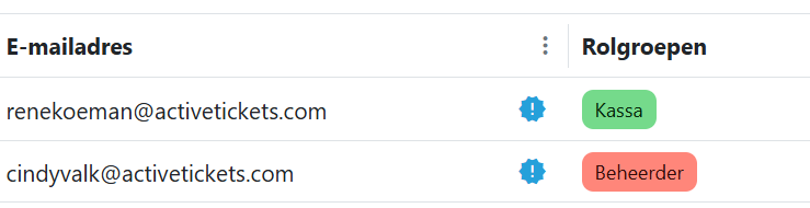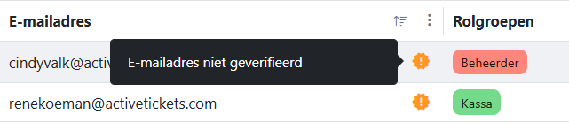 Aan het oranje uitroepteken bij het mailadres kun je in het overzicht van gebruikers zien dat er nog verificatie nodig is van het ingevoerde mailadres. Je ziet dit ook als je erover heen hovert met je muis.