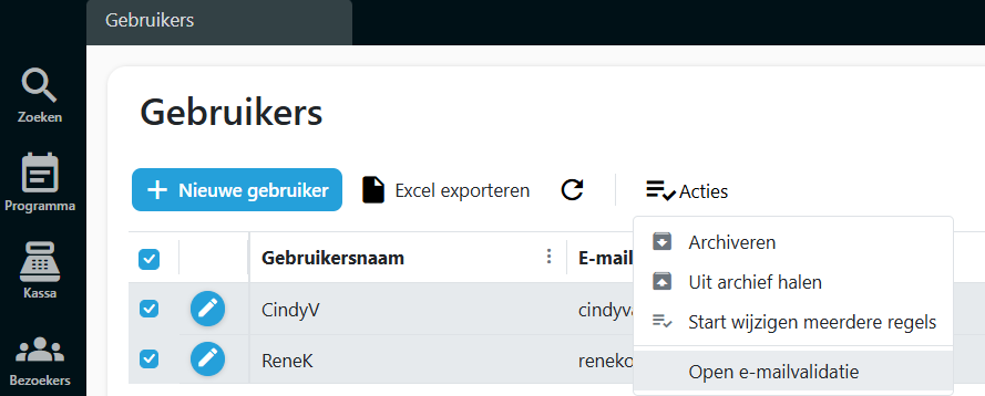 - Je kunt dit openstellen voor meerdere gebruikers in 1 keer, door de gebruikers te selecteren, en dan via de Acties knop te kiezen voor Open e-mailvalidatie