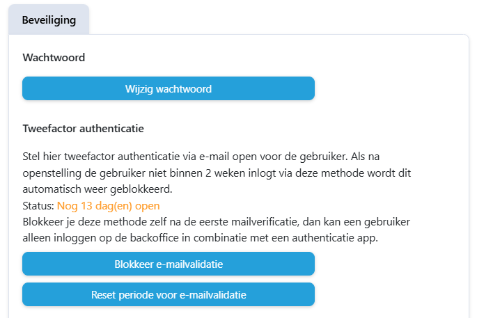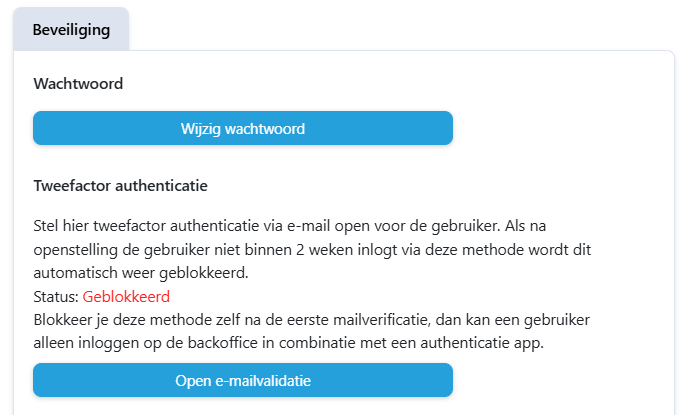 - Je kunt ook voor 1 individuele gebruiker de mailverificatie openstellen in het gebruikersscherm zelf onder Beveiliging, met de knop Open e-mailvalidatie. Let op: maak je een nieuwe gebruiker aan, dan verschijnt de optie pas nadat eerst een wachtwoord is ingesteld. Het wachtwoord is namelijk altijd nodig in combinatie met de tweede factor.