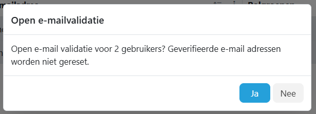 Je krijgt dan nog een pop-up, om dit te bevestigen. Gebruikers waarvoor de verificatie al heeft plaatsgevonden worden niet gereset als je ze per ongeluk in je selectie hebt meegenomen.