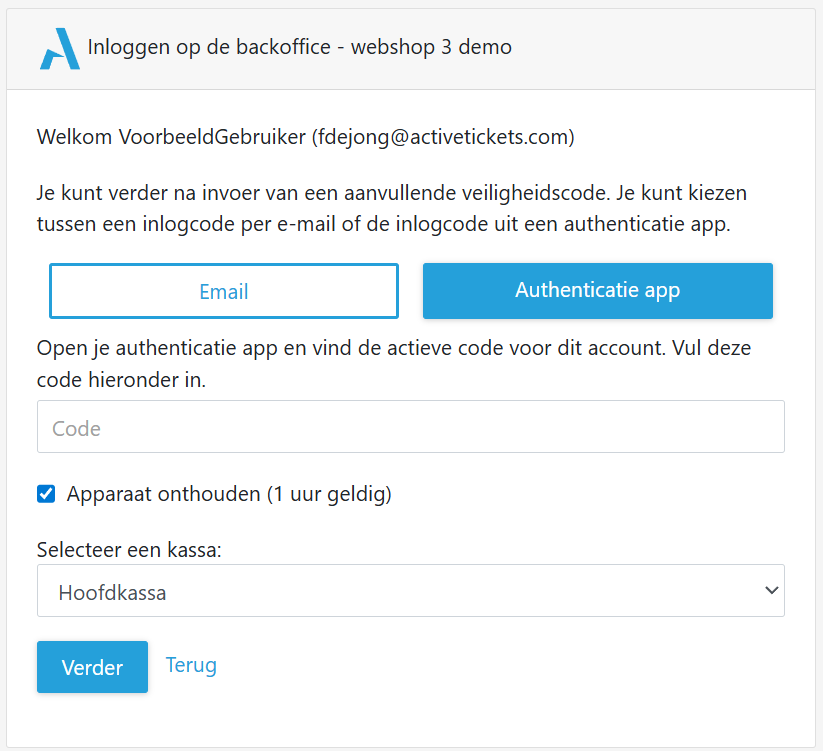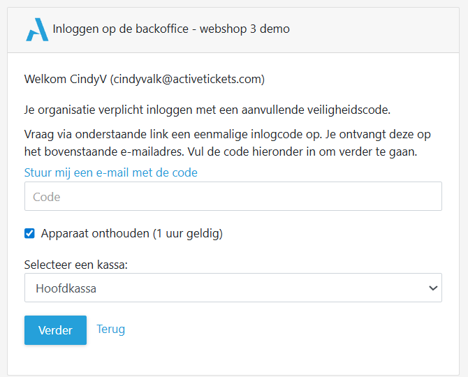 Neem contact op met ActiveTickets om de datum af te spreken waarop je de twee-factor authenticatie als inlogmethode wilt laten ingaan. ActiveTickets schakelt dit dan in. Let op: het is hiervoor noodzakelijk dat elke gebruiker inlogt met een eigen gebruikersaccount, waaraan een uniek mailadres is gekoppeld. Controleer dit van tevoren via het Gebruikers overzicht in de backoffice, zodat je direct de juiste procedure kunt inschakelen voor alle medewerkers.