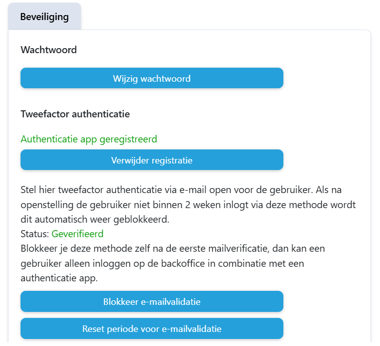 Je backoffice bevat gevoelige data over gebruikers, bezoekers en hun aankopen. Zorg er om veiligheidsredenen voor dat je gebruikers van het systeem altijd persoonlijk inloggen op de backoffice door twee-factor authenticatie verplicht te stellen. Dit betekent dat een gebruiker dan niet alleen met een wachtwoord inlogt, maar ook een aanvullende veiligheidscode. Een gebruiker ontvangt de code per e-mail of haalt deze uit een authenticatie app (bijvoorbeeld Google Authenticator app) die de gebruiker hiervoor zelf kan koppelen.