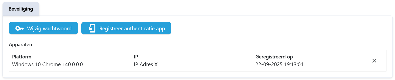 Je ziet daarnaast ook de "geregistreerde apparaten" waarop is ingelogd. Bij het inloggen kun je namelijk aangeven of je het apparaat wilt onthouden. Op organisatieniveau kan ActiveTickets instellen hoe lang de periode mag zijn waarin een gebruiker op hetzelfde apparaat mag inloggen zonder de tweede factor na eenmalige inlog met tweede factor (advies is nooit langer dan 10 uur). Je kunt een geregistreerd apparaat zelf verwijderen.