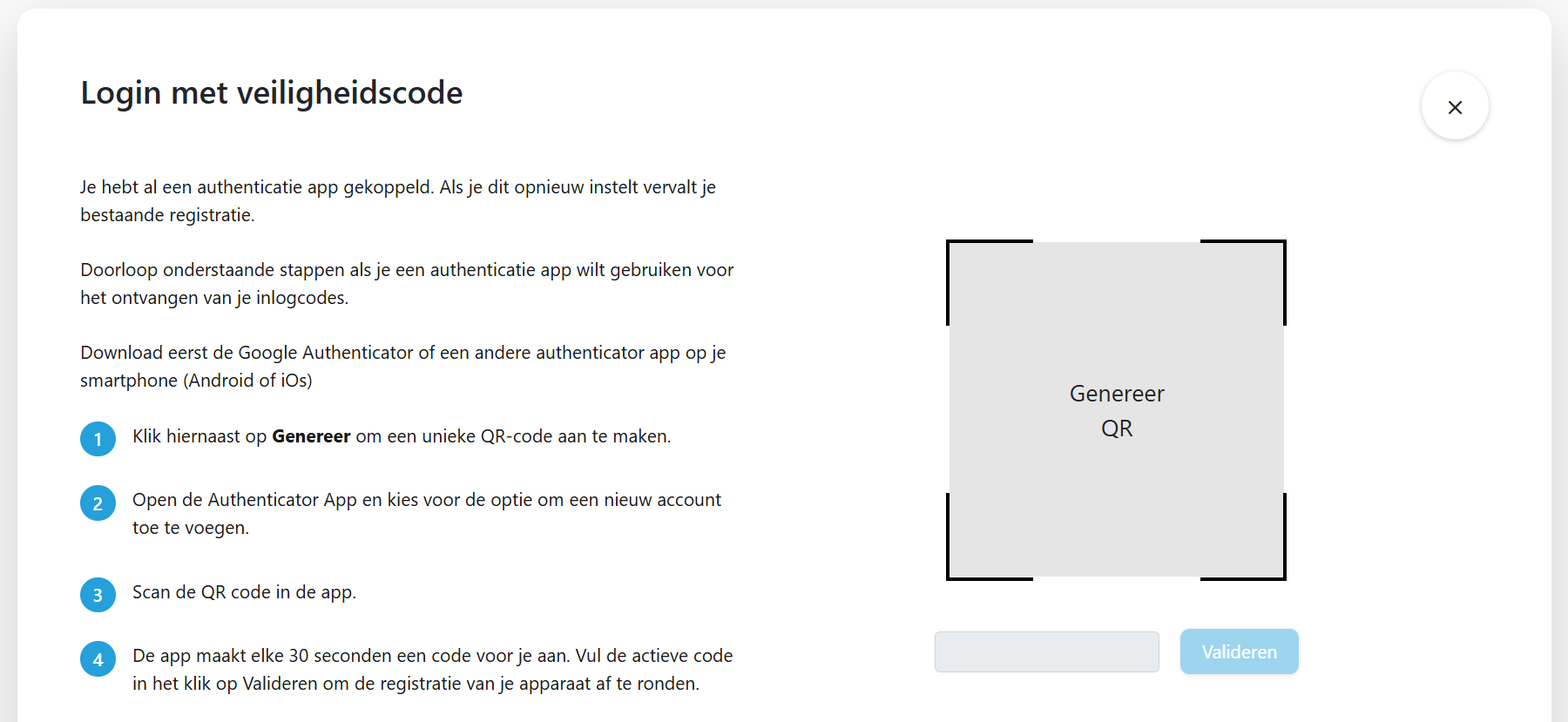 Na het scannen van de QR zie je een code in je app die je in dit scherm moet Valideren via de blauwe knop. Als de code juist is staat de app gekoppeld aan je account.