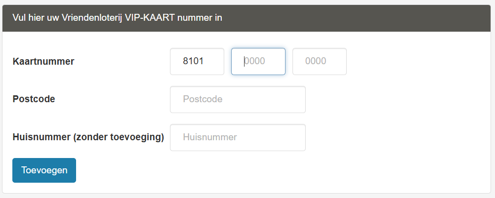 - Om van dit voordeel gebruik te maken, vult een VIP-KAART houder in het bestelproces het kaartnummer, en de bijbehorende postcode en huisnummer in.